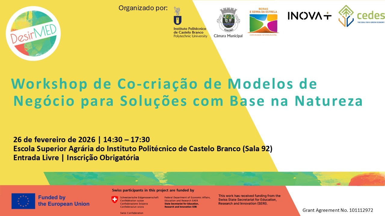 Bem-vindo ao Workshop DesirMED - Co-criação de Modelos de Negócio para Soluções Baseadas na Natureza, que terá lugar no dia 26 de fevereiro de 2026, das 14h30 às 17h30, na Escola Superior Agrária (Sala 92) do Instituto Politécnico de Castelo Branco .A inscrição é obrigatória e deve ser realizada até ao dia 19 de fevereiro. Para garantir uma melhor organização, é necessário que cada participante preencha a sua própria inscrição. Caso queira partilhar este convite com outras pessoas interessadas, solicitamos que envie o link do formulário, permitindo que cada um complete o seu registo individualmente. O DesirMED é um projeto financiado pelo programa Horizonte Europaque visa demonstrar e promover Soluções Baseadas na Natureza (NbS) para reforçar a resiliência climática no Mediterrâneo. Na região das Beiras e Serra da Estrela estão a ser desenvolvidos três pilotos focados em fruticultura, floresta e agricultura/pecuária. Este workshop pretende criar modelos de negócio sustentáveis para esses projetos e contribuir para a construção de uma visão partilhada para a resiliência climática regional. O público alvo é altamente diversificado no sentido de atrair conhecimento de diversos setores de atuação. Não é necessário conhecimento/experiência prévia em modelos de negócio.